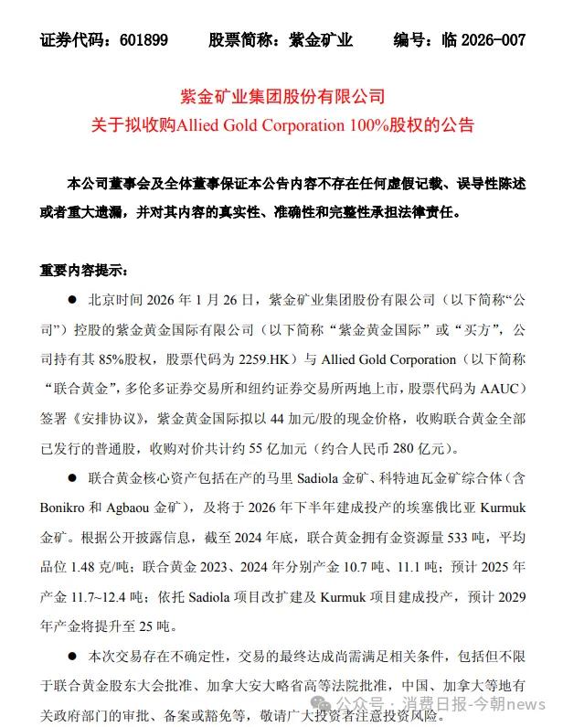 Just a few days ago, Zijin Mining made another move, announcing that Zijin Gold International, which it controls, planned to acquire all issued and outstanding common shares of Canada’s Allied Gold Corporation (Allied Gold) at a cash price of CAD 44 per share. The total consideration is about RMB 28 billion, in order to secure three gold mine projects in Africa.